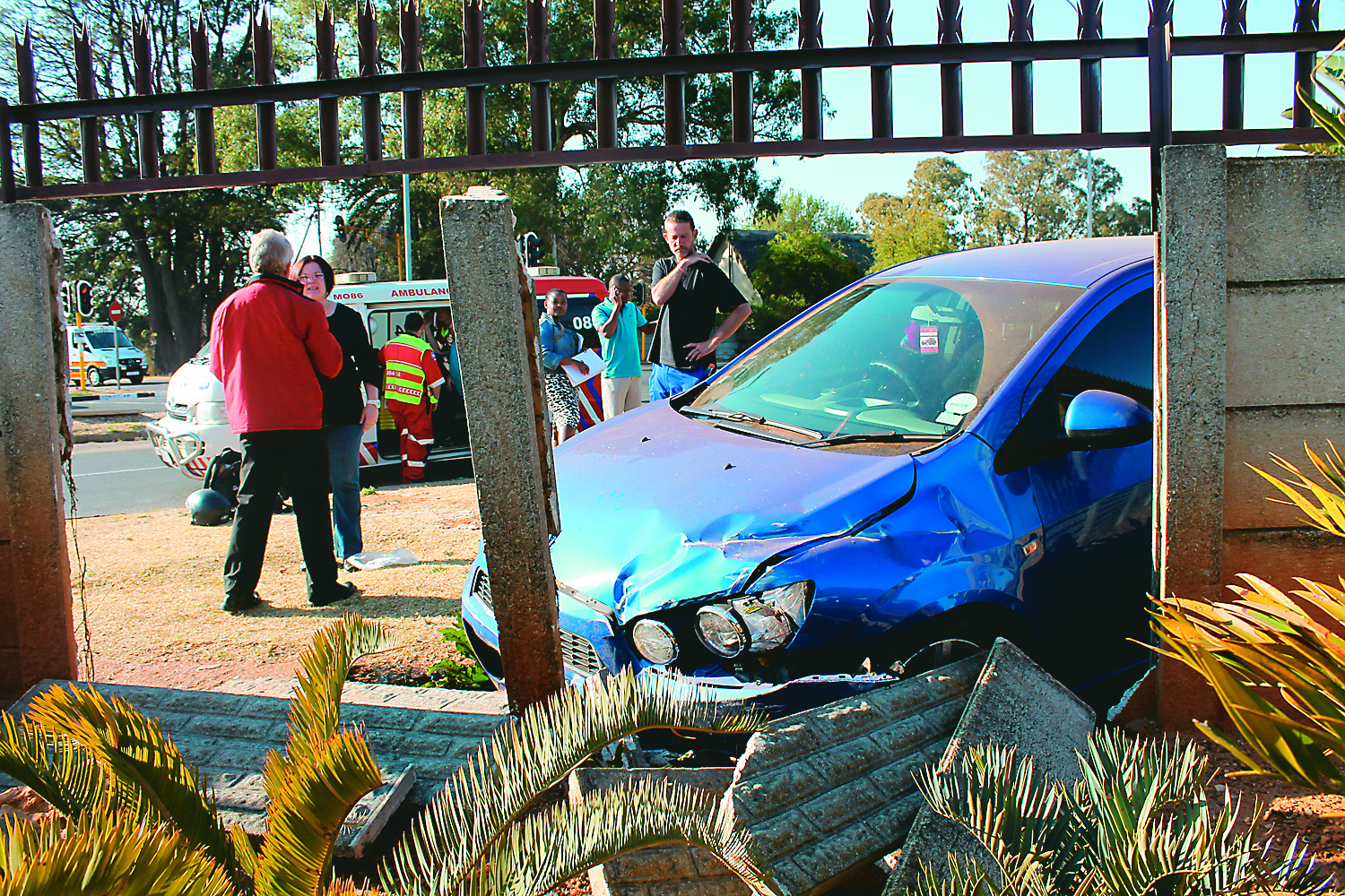Another vehicle – a Chevrolet Sonic – travelling on Corlett Avenue towards Ontdekkers Road allegedly increased speed to go through the orange light. As the driver saw that she was not going to make it, she decided to swerve left to avoid crashing into the turning BMW and to stop against a tree, but instead crashed through a residential wall.