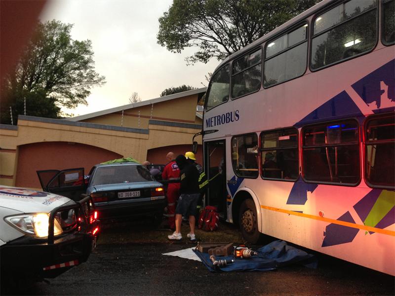 The paramedic says that the motorist had sustained multiple fractures on his one leg and a head injury, while the biker had less serious injuries. Neither the driver nor the commuters on the bus sustained any serious injuries.