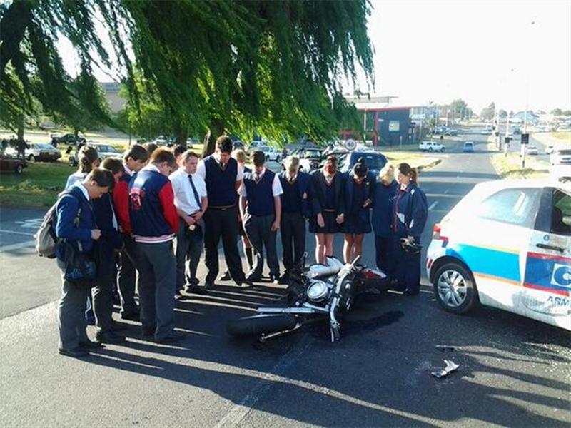Considering the fact that there had been many fatal accidents involving motorcyclists and motorists in Roodepoort over the past few weeks, it was remarkable to see more than 15 pupils forming a circle in prayer at the accident scene.