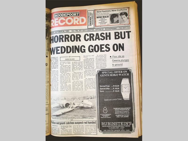 “Horror crash but wedding goes on” reads the front page article by a young Gien Elsas, who today trains journalists at the Caxton Acadamy, while columnist Clive Buchler was at the helm of the paper as editor.
