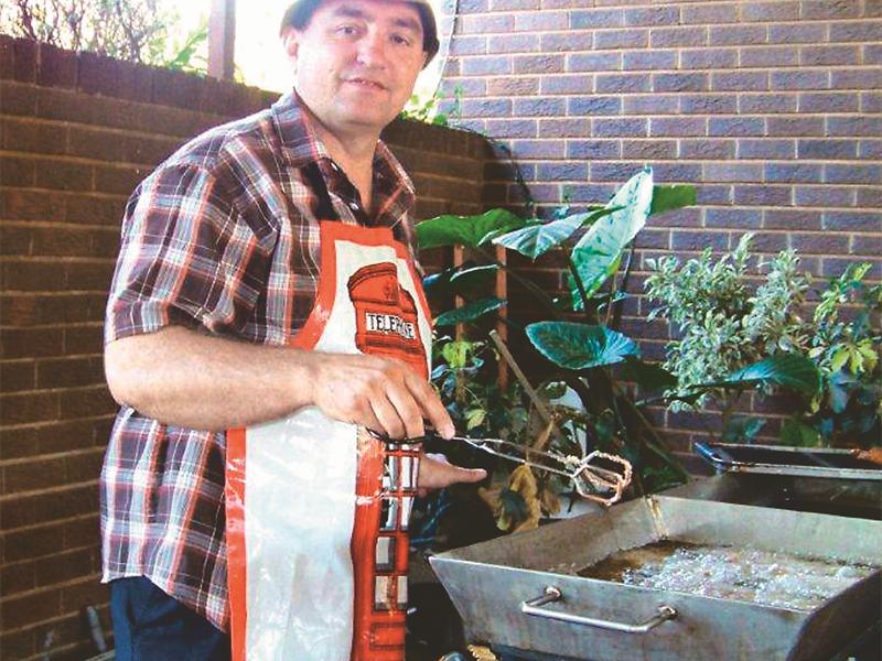 Die Gereformeerde Kerk Ontdekkers het op Saterdag 2 November hul jaarlikse oggendmark gehou waar hul unieke ‘Dopper-burgers verkoop is. Hier is ds Hendrik Stoltz besig om die vleis vir die kerk se eie burger gaar te maak. Gemeentelid Susan Preller het vertel dat die oggendmark baie suksesvol was en dat “al die Dopper-burgers wat voorberei is, al teen 2nm uitverkoop was”. Foto: Susan Preller.