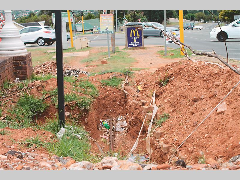 Diensleweraars grawe reuse gate in die sypaadjies wanneer hulle herstelwerk doen maar gooi dit nie weer toe en maak dit netjies nie. So is daar een van die gate op die hoek van Wilgeroodweg en CR Swartrylaan wat blykbaar al vir meer as twee maande so oopstaan.