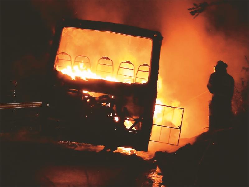 Emergency Management Services (EMS) arrived at approximately 7.30pm to put out the flames that was engulfing the bus.