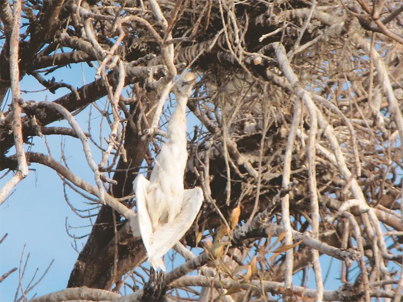 A bird tangled up in fishing line hanging on the island on Florida Lake.