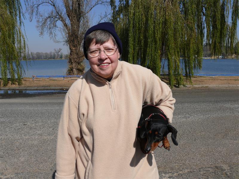 Hulda Snyman also lives close by. She stops with her sausage dog in tow.