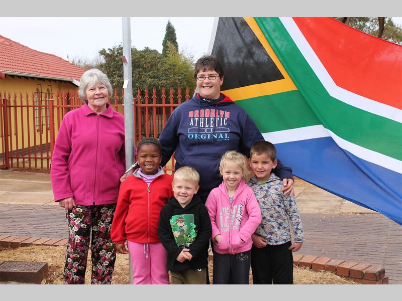 Volgens die hoof, Marie Grobler word dit deesdae van kleuterskole vereis om ‘n Suid-Afrikaanse vlag te hys op hul persele. Die Kuns en Kultuurdepartement het haar ‘n paar weke gelede gekontak en het laas week self ‘n paal en vlag op hul perseel in Bottlebrushstraat kom installeer.