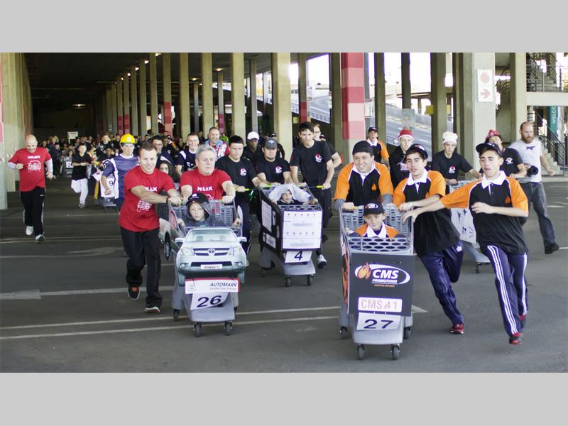 The event entails a shopping trolley that is being pushed by three people and the fourth person acts as the pilot, sitting in the trolley as the team races through the parking area of the mall, totalling 2km.
