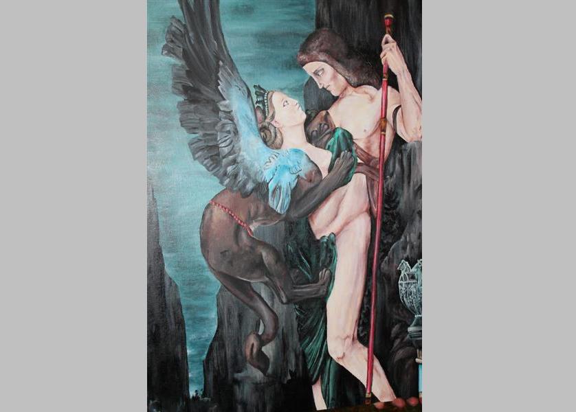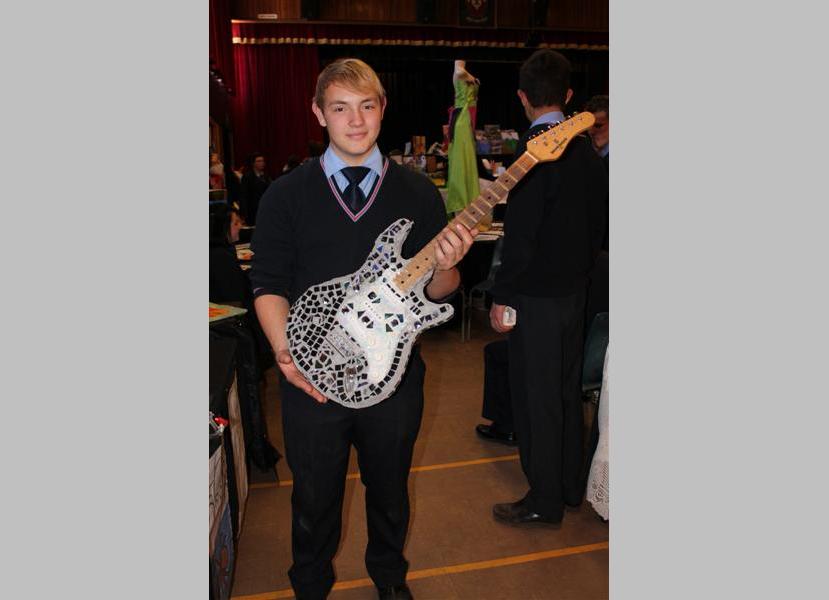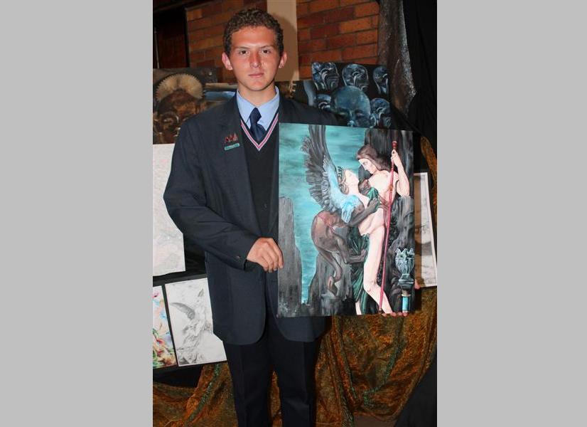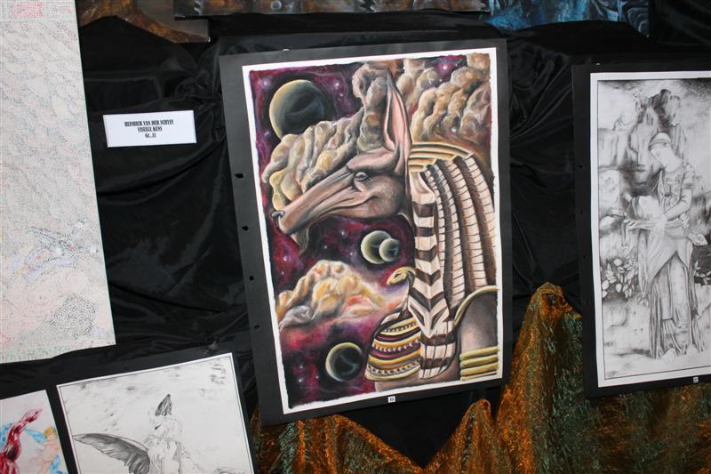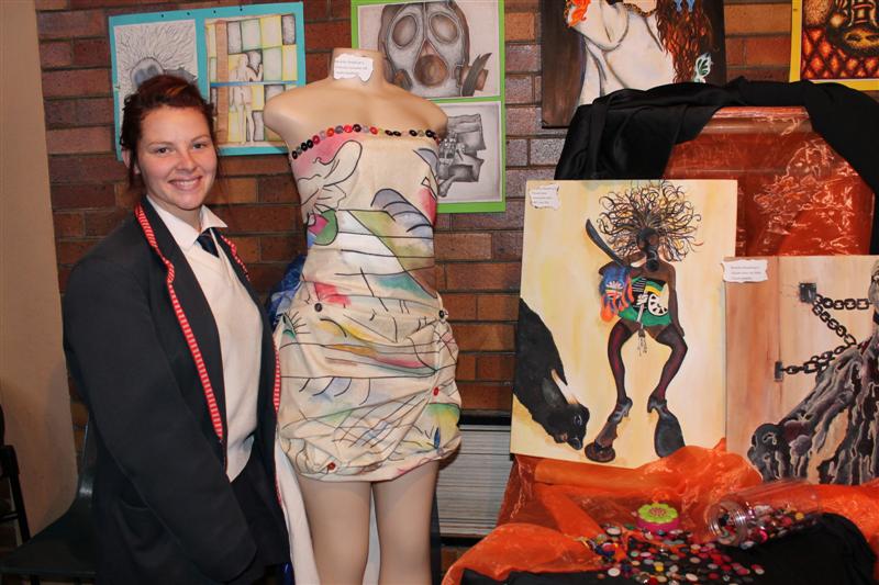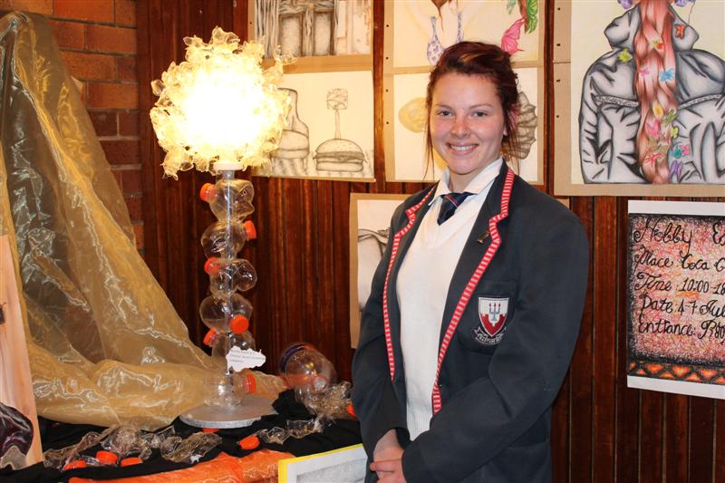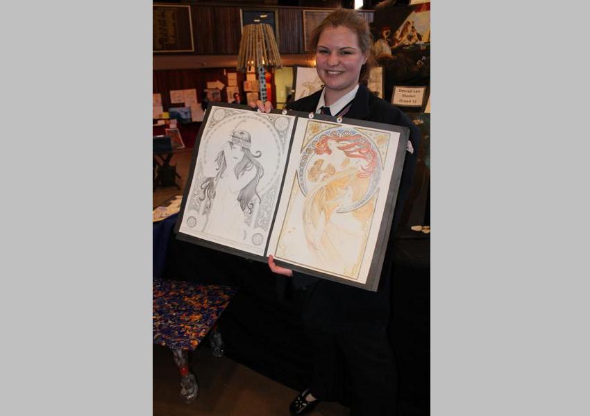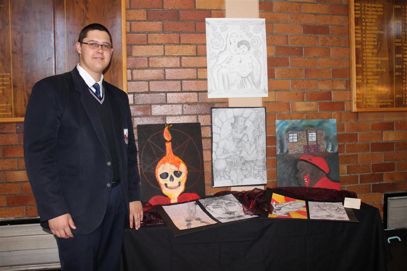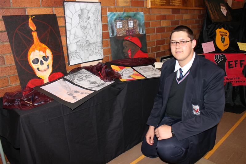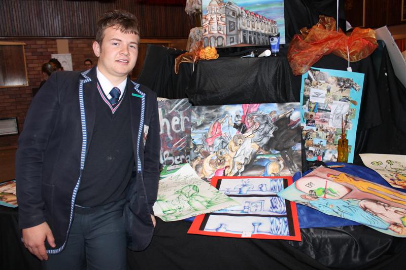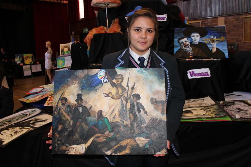 Leerlinge uit die kunsklasse bied 'n praguitstalling van kuns in die skoolsaal.