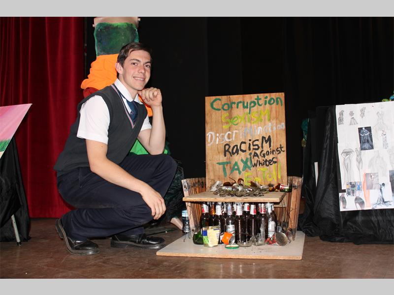 Deon van der Merwe, nog ‘n matriekleerling, het ‘n sterk politieke opinie wat hy met mening uitgedruk het in sy installasiewerk getiteld Pyn in die g*t.