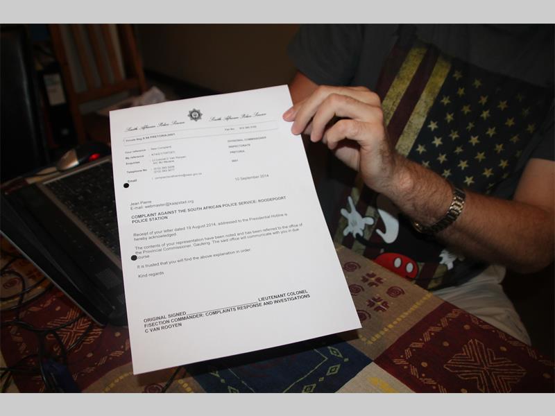 Ardinoit says the exchange was quite comical because the person asked him how to reply his email. He explained that one has to use the ‘reply’ function. Then the man wanted to know how he could contact Ardinoit to which he replied that he had just phoned him. He says the man’s grasp of the English language also was questionable. Nevertheless on 10 September he received an email acknowledging that the Presidents’ Office received his complaint and that Roodepoort SAPS had been instructed to investigate it.