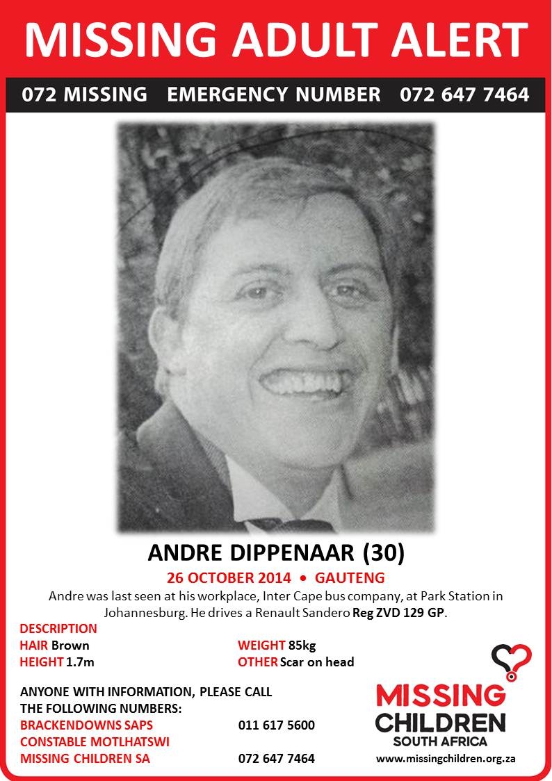 André Dippenaar, 30, was last seen at his workplace, InterCape Bus Company, at Park Station in Johannesburg on 26 October. He drives a Renault Sandero with registration number ZVD 129 GP. He has brown hair, is 1,7m tall and has a scar on his head. Contact Constable Motlhatswi on 011 617 5600 with any further information on him.
