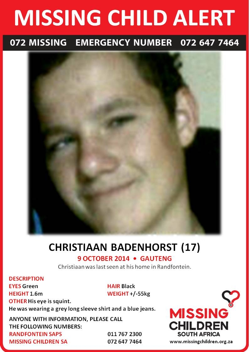 Christiaan Badenhorst, 17, was last seen at his home in Randfontein on 9 October. He was wearing a grey long-sleeve shirt and blue jeans. Christiaan has green eyes, black hair and is 1,6m tall. His one eye is squint. Contact Randfontein Police on 011 767 2300 with any further information on him.