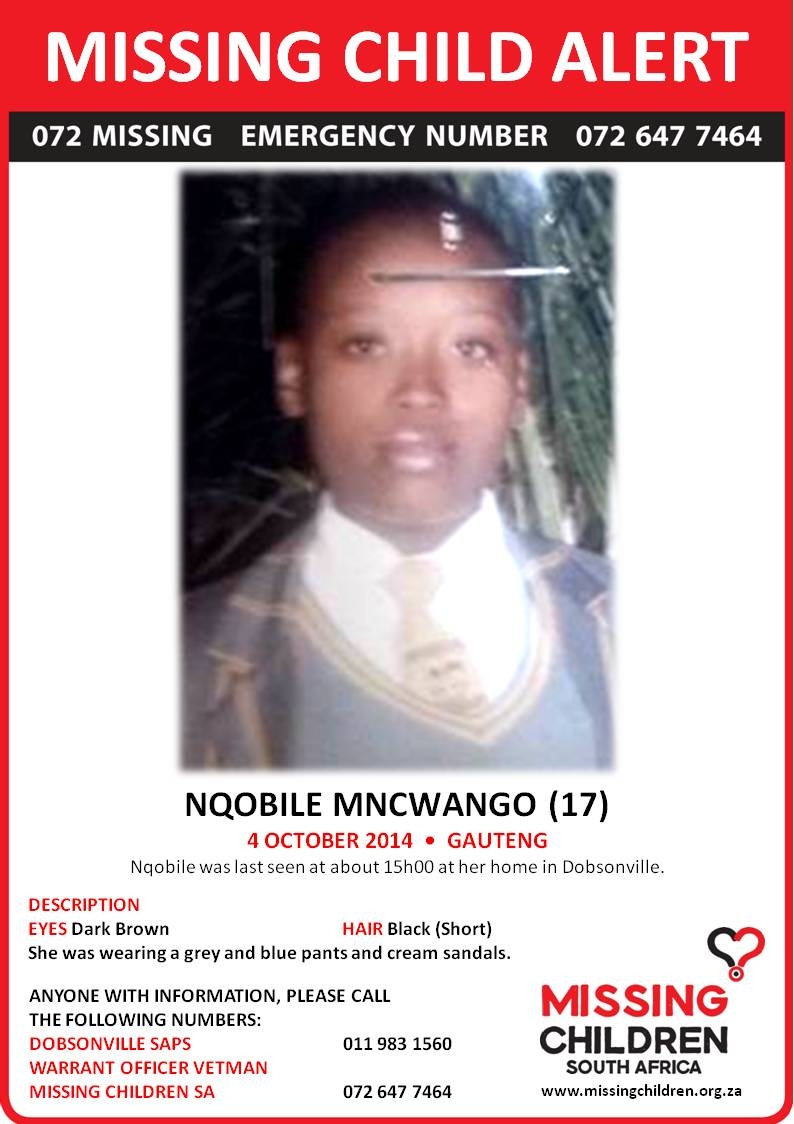 Nqobile Mncwango, 17, was last seen leaving her home in Dobsonville at around 3pm on 4 October. She has dark brown eyes and black hair and was wearing a grey shirt, blue pants and cream sandals. Contact Warrant Officer Vetman on 011 983 1560 with any further information on her.