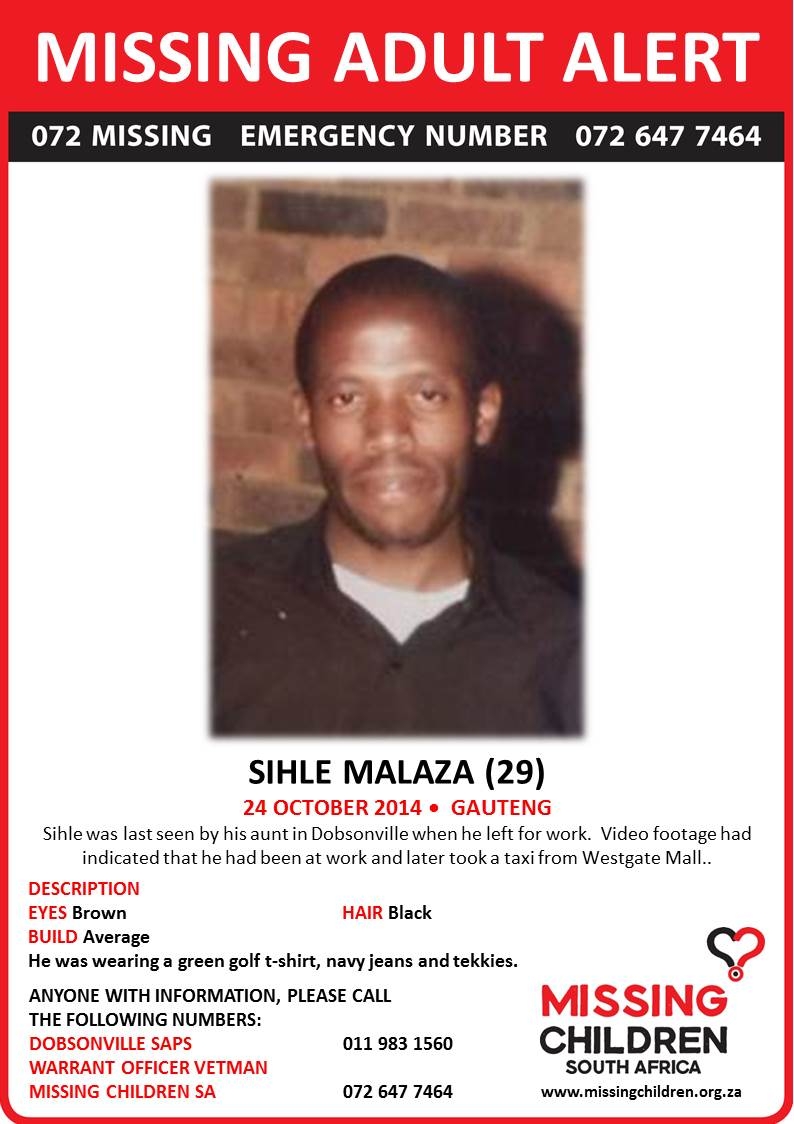 Sihle Malaza, 29, was last seen by his aunt in Dobsonville on 24 October when he left for work. Video footage indicated that he had been at work and later took a taxi from Westgate Mall. Malaza has brown eyes and black hair and was wearing a green golf T-shirt, navy jeans and tekkies. Contact Warrant Officer Vetman of the Dobsonville Police on 011 983 1560 with any further information on him.
