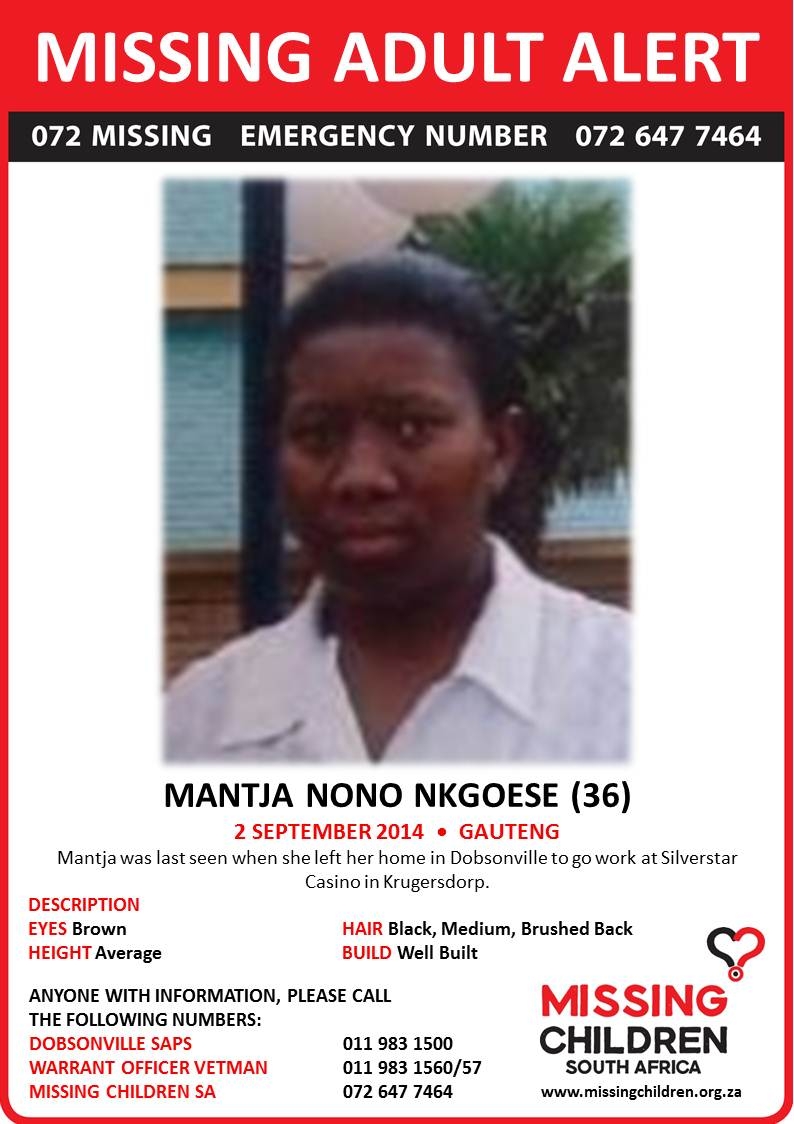 Mantja Nono Nkgoese, 36, was seen last leaving her home in Dobsonville to go to work at Silverstar in Krugersdorp. She has brown eyes with medium length black hair, which usually is worn brushed back. Contact Warrant Officer Vetman of the Dobsonville Police on 011 983 1560 with information of her whereabouts.