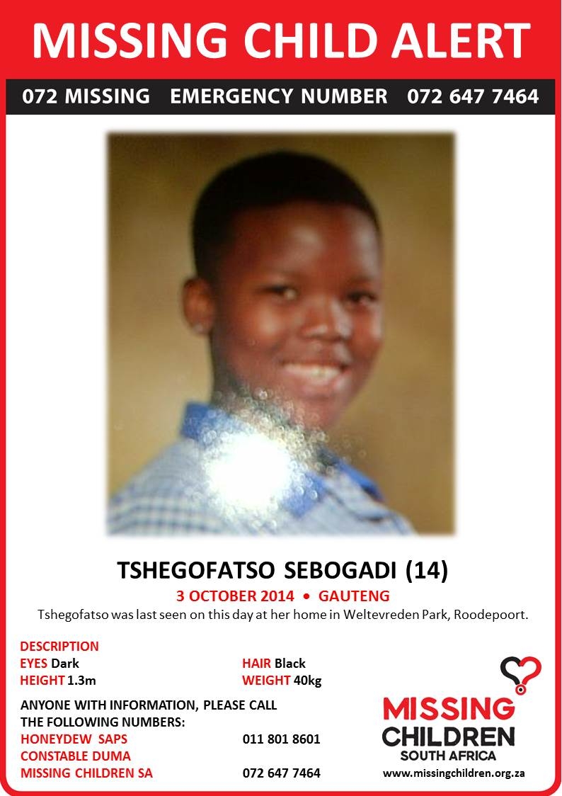 Tshegofatso Sebogadi, 14, was seen last in Weltevreden Park on 3 October. She has dark eyes, black hair and is 1,3 metres tall. She weighs 40kg. Contact Constable Duma of the Honeydew Police on 011 801 8601 with information of her whereabouts.