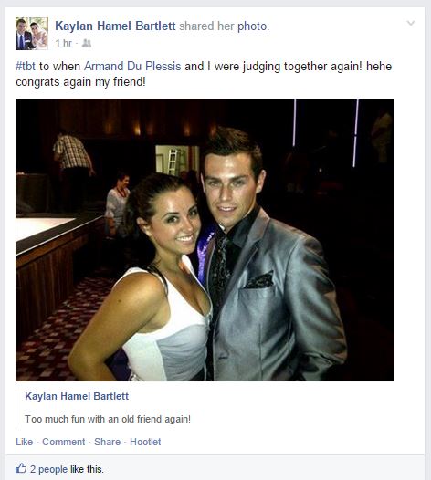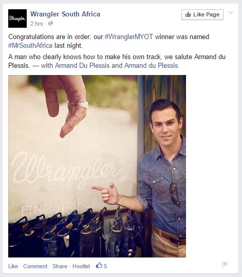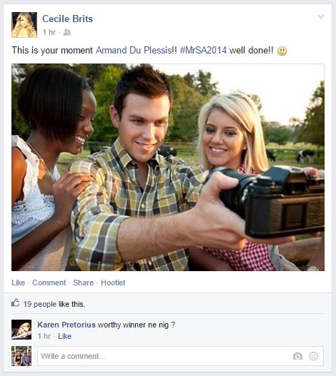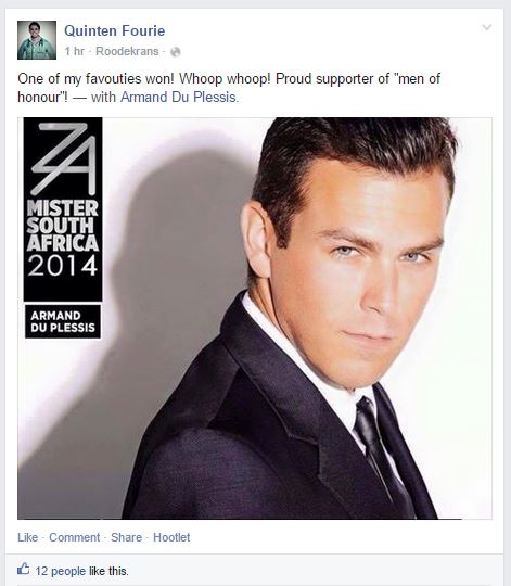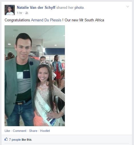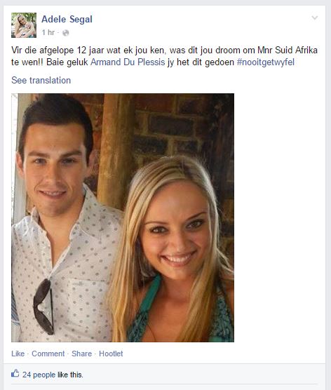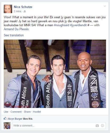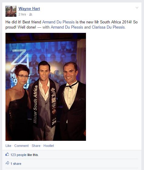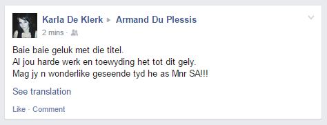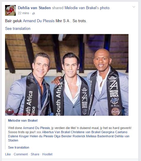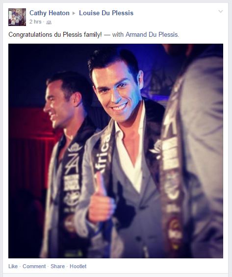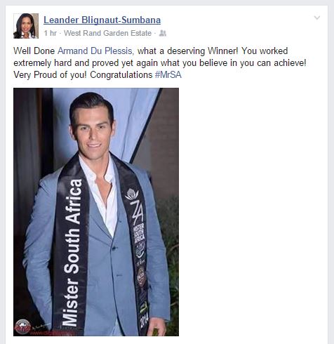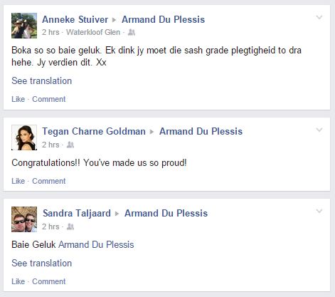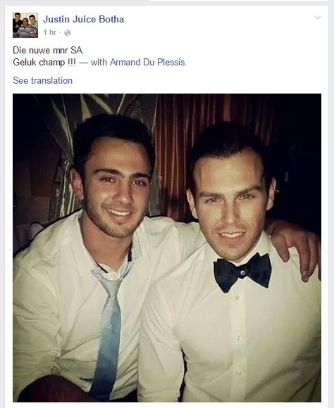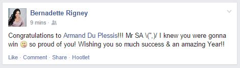 Congratulations from friends, family, fellow contestants, other pageant people and corporates are streaming to Armand du Plessis' facebook profile.