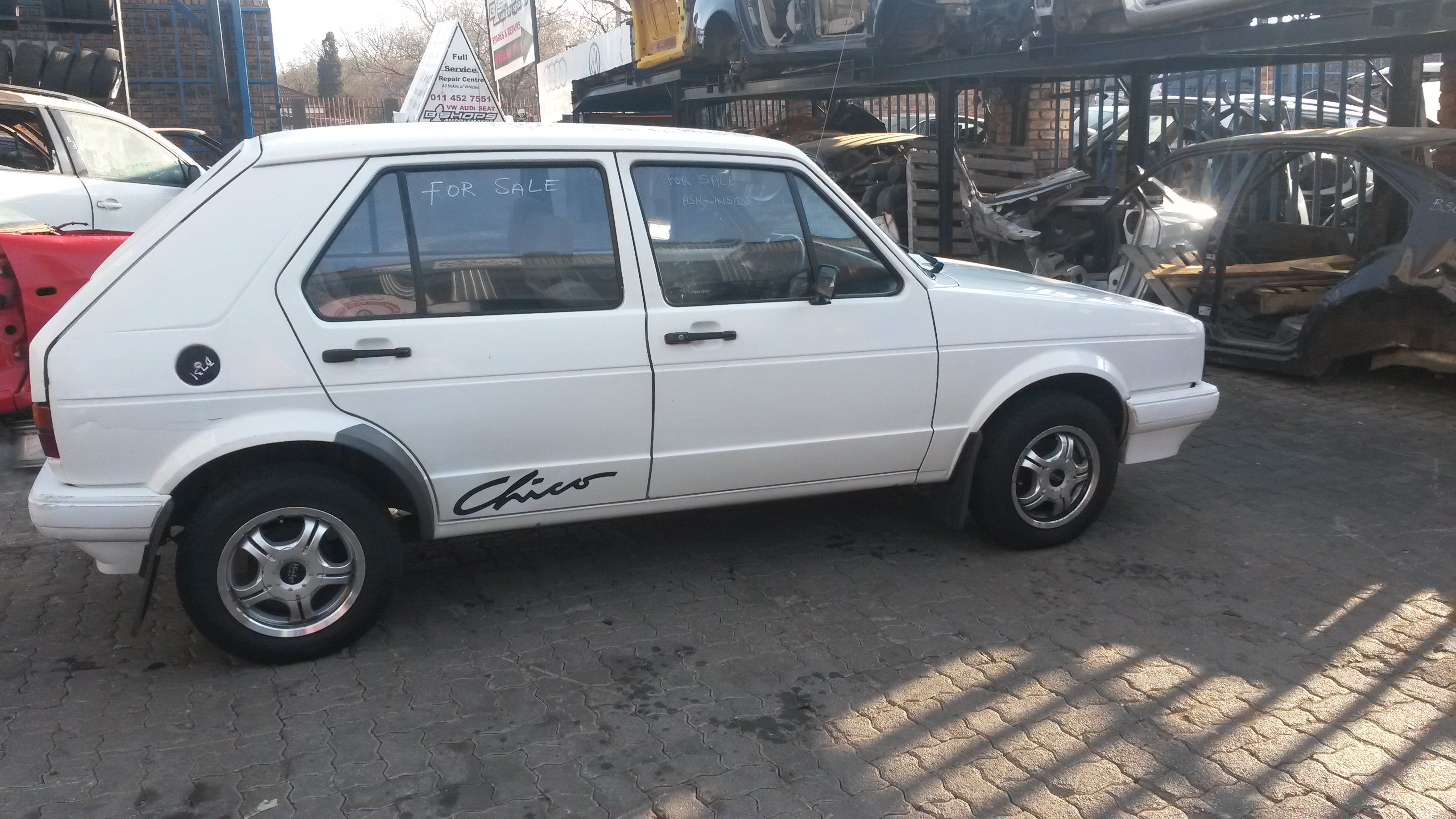 Two suspicious men are travelling in a white VW Citi Golf along the road.