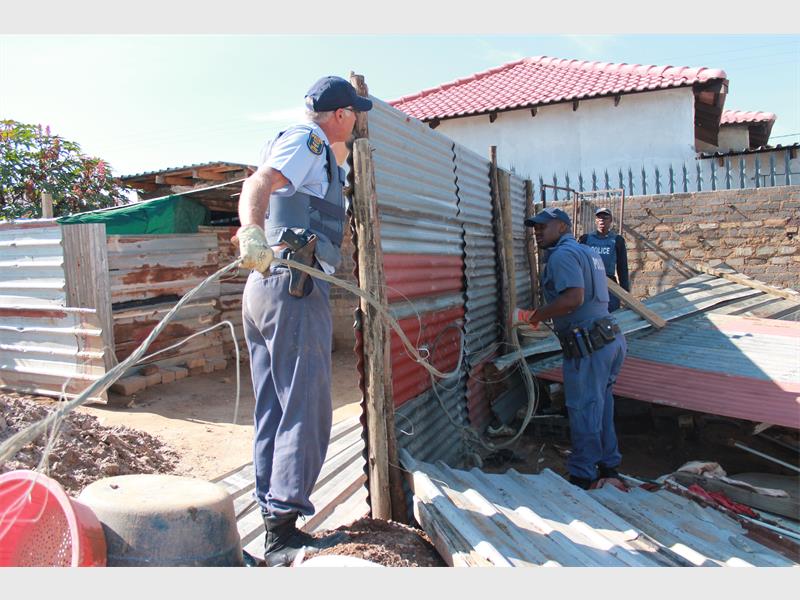 Today, Tuesday 24 March Roodepoort Police members belonging to the Crime Prevention Unit busted open and demolished ‘mining shacks’ to the left of Matholesville Park. Their operation in the area started at around 7.15 am after they had performed similar operations in Sol Plaatje from 6 am.