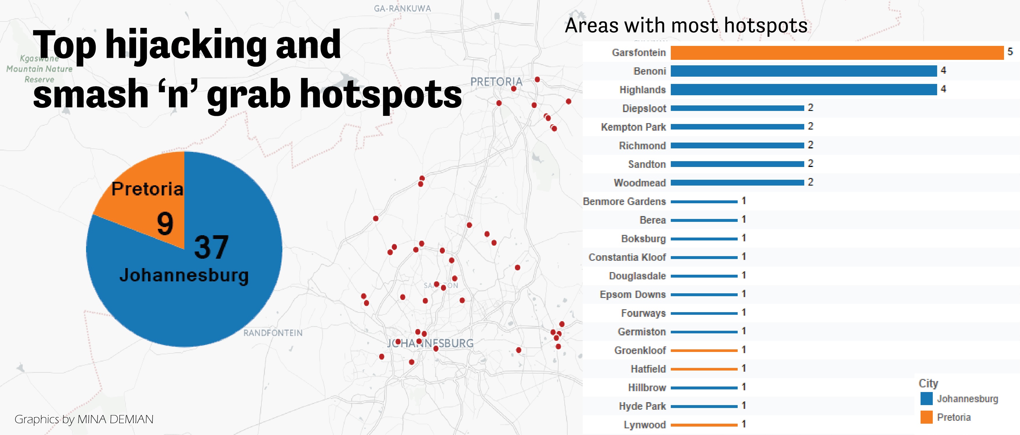 Use our interactive map to see where the top hijacking and smash 'n' grab hotspots are in Johannesburg and Pretoria