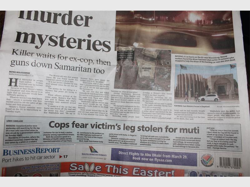 Op die toneel het hulle ‘n brandende motor en Hennie de Vries se lyk in sy wit Bantam-bakkie, met vier koeëlgate deur die voorruit aangetref. Die bakkie was voor die brandende Fiat 500 geparkeer. Eers nadat die vuur geblus is, het lede van die brandweer die koeëlgate in die bestuurder se deur gesien. ‘n Ouer man se lyk is in die Fiat gevind. Op 19 Maart het The Star berig dat die moordenaar/s die ander man, ‘n voormalige polisielid by name Sam Moloto, 58, ingewag het en verskeie kere geskiet het. Dit is nie seker of hy aan sy skietwonde of in die brand wat sy moordenaars gestig het, gesterf het nie. Die polisie ondersoek ‘n dubbele moordsaak.