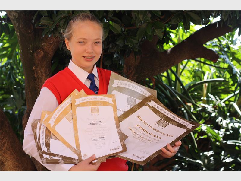 Inteendeel het die Graad 7 Laerskool Helderkruin-leerling het met 20 toekennings, waarvan sewe diplomas, vyf goue sertifikate en agt gevalle waar sy die item wenner was weggestap.