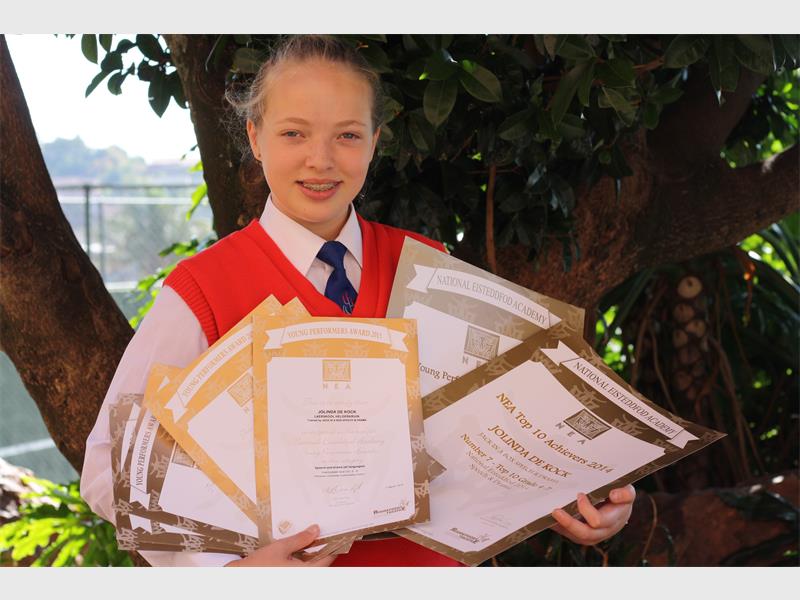 Inteendeel het die Graad 7 Laerskool Helderkruin-leerling het met 20 toekennings, waarvan sewe diplomas, vyf goue sertifikate en agt gevalle waar sy die item wenner was weggestap.