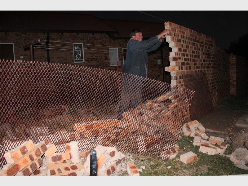 At around 5.30pm on Wednesday night 17 June an unidentified man driving a silver bakkie and his female passenger crashed through the boundary wall on Reyger Street, reversed the bakkie out, picked a few of its broken-off parts up and drove off. Where the bakkie hit the wall was directly behind an elderly woman’s flat in the park, creating a gap in the wall of about four metres. The Western Suburbs Roodepoort Neighbourhood Watch (WSRNW) patrollers were alerted via radio.
