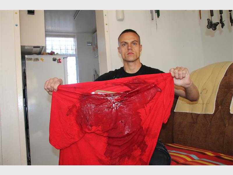 Although the incident took place on Monday, De Beer’s shirt he wore during the robbery was still drenched with blood on Wednesday.