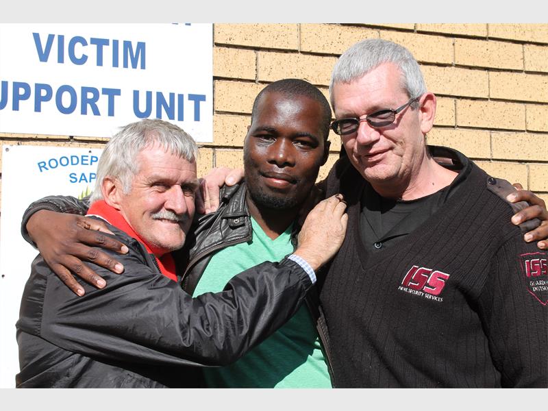 Chris Thubakgale owes his life to tow truck driver Wouter Steyn and security officer Marius Grobler. Wouter helped him out of the burning police vehicle while Marius still tried to extinguish the fire. Steyn also encouraged him to crawl to safety within seconds of the car exploding, killing both his colleagues, Elias Thabo Dibete and Thulasizwe Skhahla. The accident happend when an alleged drunk driver crashed at high speed into the back of their vehicle while they were patrolling on Ontdekkers Road in the early hours of that morning.