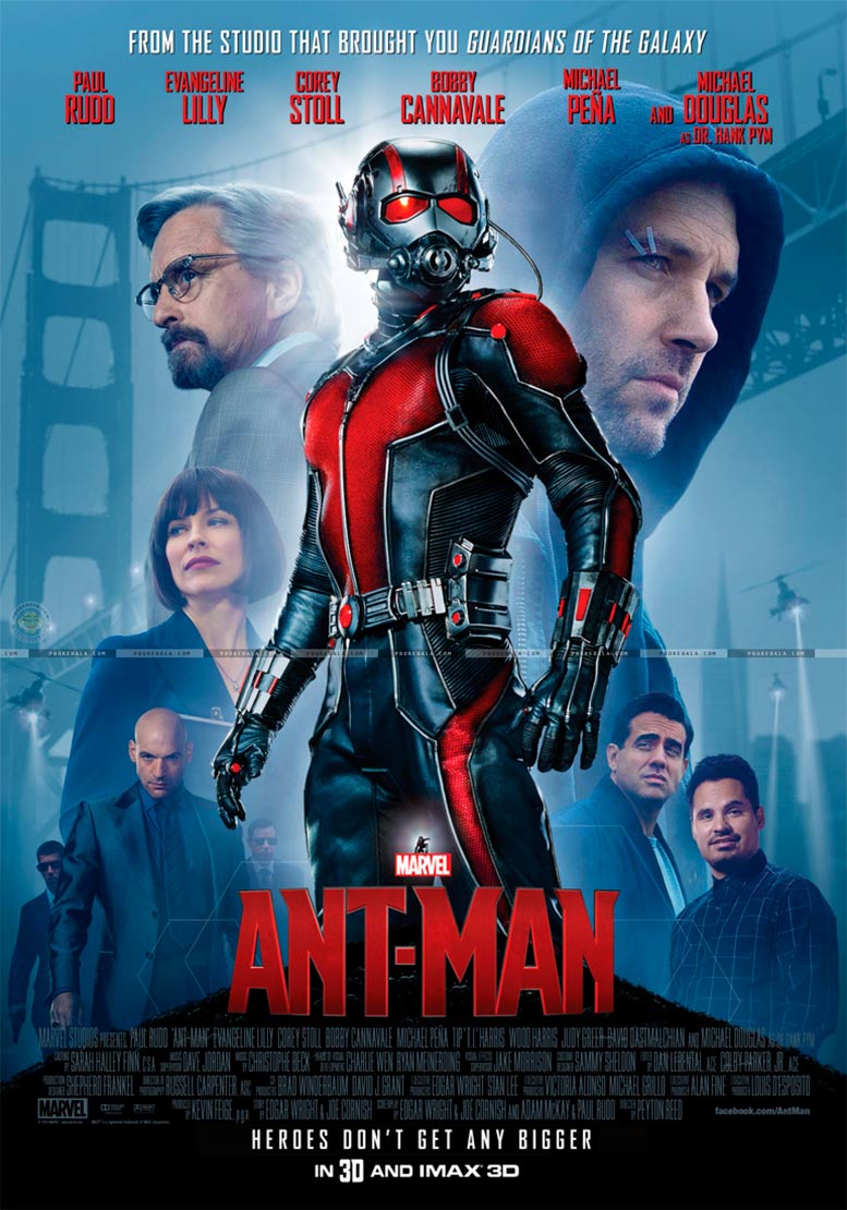 Starring: Paul Rudd, Evangeline Lilly, Corey Stoll, Bobby Cannavale, Michael Peña, Tip “T.I.” Harris, Wood Harris, Judy Greer, David Dastmalchian, Michael Douglas