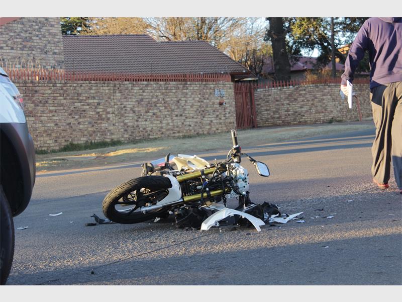 Nobody was seriously injured when a motorcycle and a motor vehicle collided on Corlett Avenue in Witpoortjie this morning.