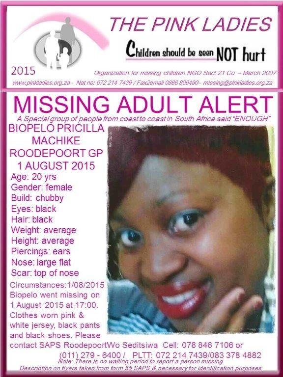 Another Roodepoort woman, Biopelo Priscilla Machike, has been reported missing as of 1 August.