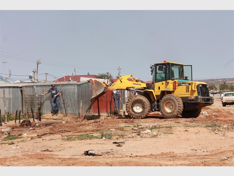 They were assisted by Joburg Water in disconnecting water connections to ‘shack’ shells where illegal mining operations take place. These shacks were also bulldozed and mining holes were filled with the help of vehicles and equipment from the mining industry.
