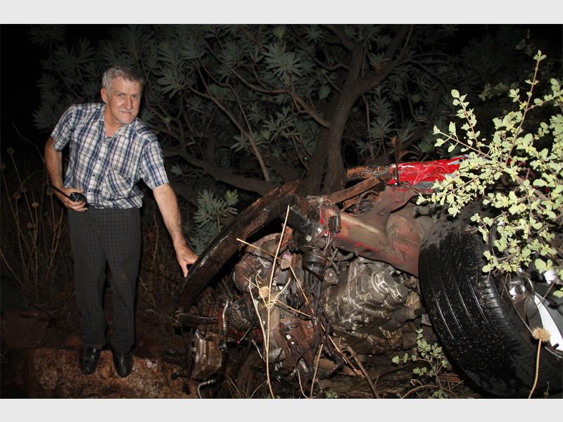 It is speculated that the man was speeding, according to Wouter Steyn of A1 Assist, more than 100km/h in the 60km/h zone, and did not managed the stop at the T-junction of CR Swart and Doreen Roads. Coming from the CR Swart side he went right across the stop street and through the barrier. He rolled his vehicle which was stopped by a small tree.