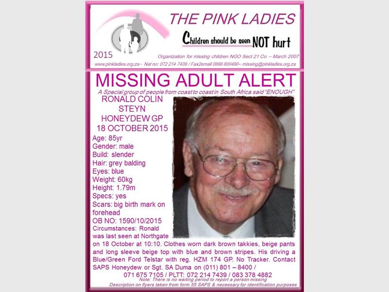 The 85-year-old Honeydew pensioner, Ronald Colin Steyn who went missing on Sunday, has been found.