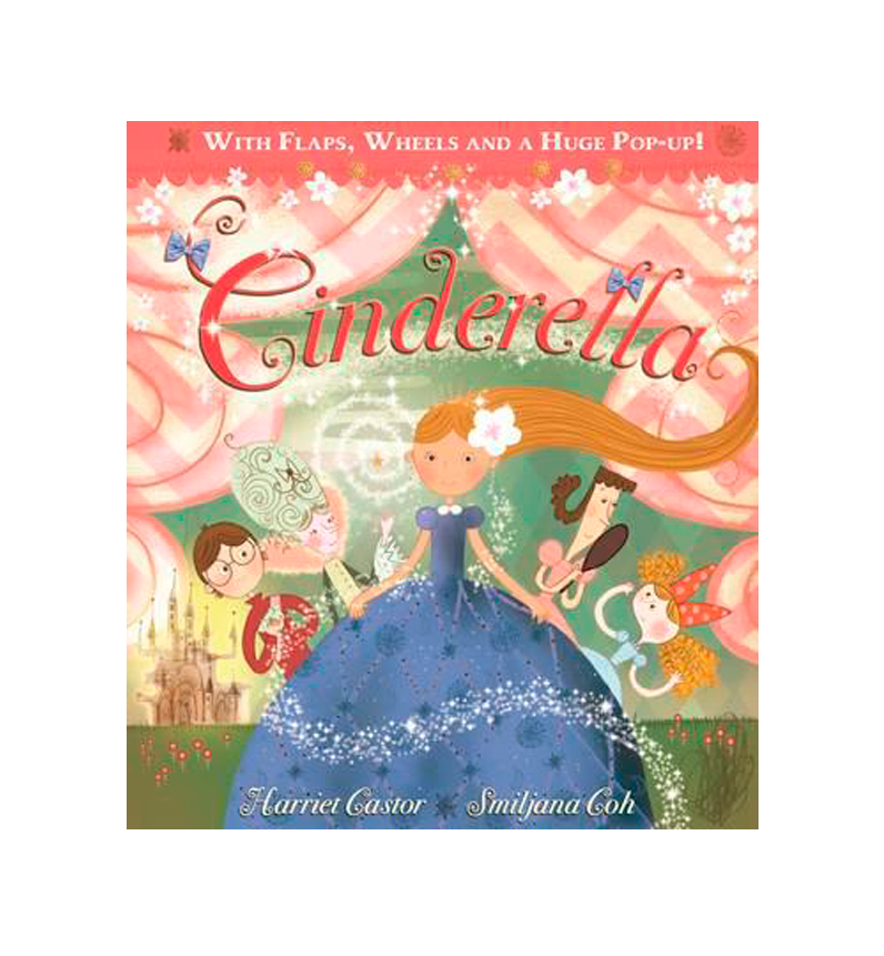 Join in the fun by opening the wheels as you peek inside Cinderella's house.