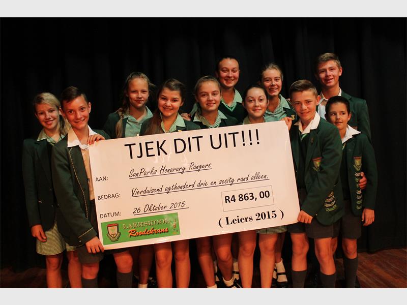 Vanoggend (Maandag 26 Oktober) het die skool ‘n tjek vir R4 863 aan Ken Schmidt, ere veldwagter by Sanpark, gedurende die saalopening oorhandig. Saam met hom het ouer Jakes Oosthuizen, wat oorspronklik met die inisiatief na vore gekom het, gestaan. Leier Lyndré Kruger, wat saam met Reegan Mestré die fondsinsamelings georganiseer het, het aan leerlinge en onderwysers verduidelik waarvoor die projek gaan. Sy het ook ‘n video gewys wat die leiers gemaak het waarin hulle met leerlinge oor renosterstropery gesels.