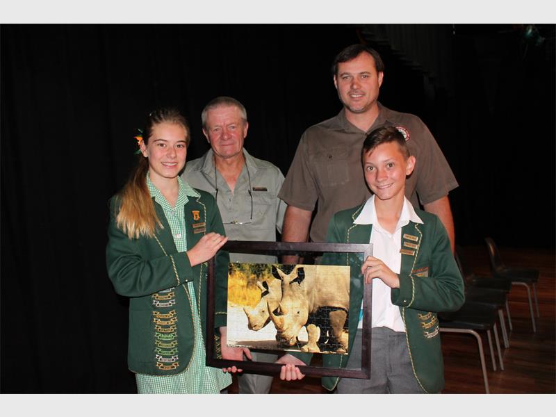 Vanoggend (Maandag 26 Oktober) het die skool ‘n tjek vir R4 863 aan Ken Schmidt, ere veldwagter by Sanpark, gedurende die saalopening oorhandig. Saam met hom het ouer Jakes Oosthuizen, wat oorspronklik met die inisiatief na vore gekom het, gestaan. Leier Lyndré Kruger, wat saam met Reegan Mestré die fondsinsamelings georganiseer het, het aan leerlinge en onderwysers verduidelik waarvoor die projek gaan. Sy het ook ‘n video gewys wat die leiers gemaak het waarin hulle met leerlinge oor renosterstropery gesels.