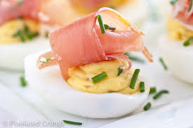 Deviled eggs, also known as eggs mimosa, stuffed egg, salad eggs or dressed eggs, are hard boiled eggs which have been boiled, shelled, cut in half and filled with the hard-boiled egg’s yolk mixed with other ingredients such as mayonnaise and mustard. Other frequently added ingredients include: tartar sauce, Worcestershire sauce, diced pickle, pickle relish, salt, pepper, cayenne pepper, chipolte chillies, turmeric, vinegar, green olives, pimentos, poppyseed, thyme, cilantro, minced onion, caviar, cream, capers or sour cream. After the filling is scooped or piped back into the egg cup, it is often times sprinkles with paprika as a garnish. Caviar, anchovy, bacon, herring or jalapenos are some of the other popular options that are sometimes used as a garnish to decorate the deviled eggs.