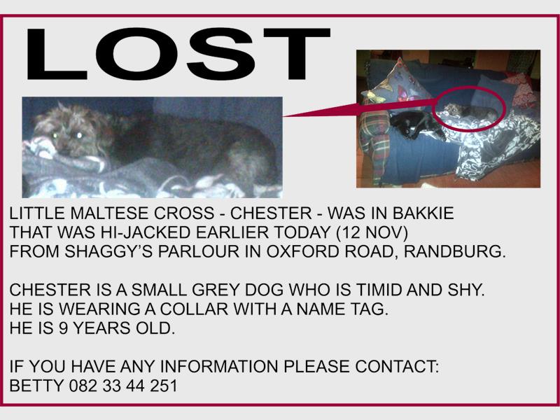 Should anyone in the surrounding areas see the van or the dog, please call 011 889 0659.