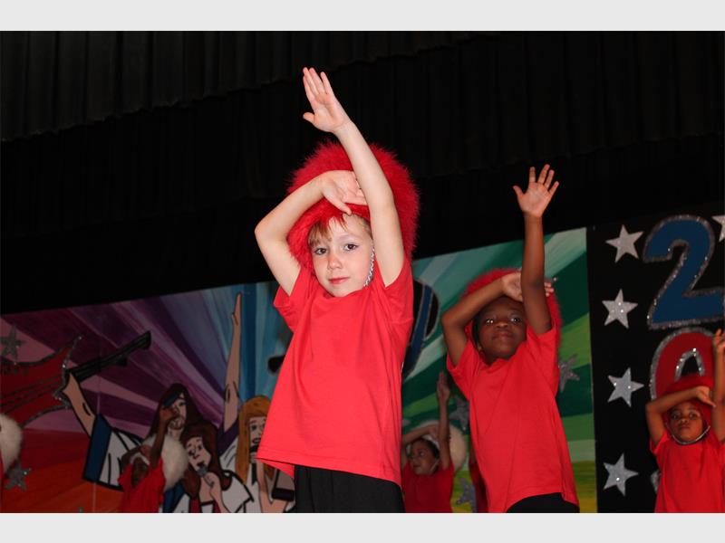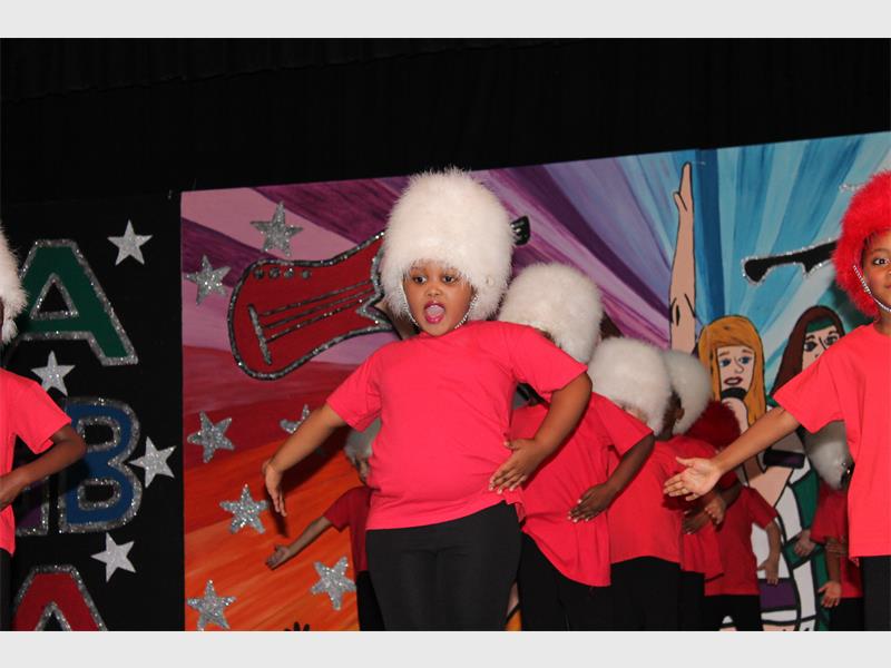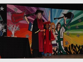 Before the actual graduation ceremony, the Sterretjie Drummies performed for them. Galaletsang Molale, 6, led the pack in singing and counted a loud “1, 2, 3, 4, 5, 6, 7, 8” throughout the performance so her classmates could keep up. They performed a medley of Abba songs, fitting the evening’s theme. Thereafter Embré Ludick, 6, wowed the audience with his amazing tap dancing skills, a real little Lord of the Dance himself.