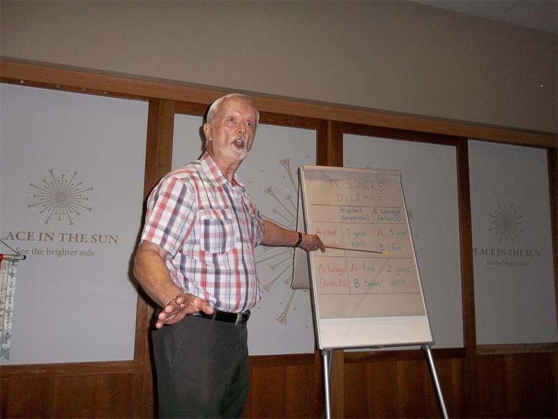 Michael Glencross spoke next on cooperation and competition, which raised listeners’ curiosity levels. He argued if both parties cooperate, both stand to gain rather than lose from the experience. He utilised an analogy revolving around two prisoners who sit isolated, each accused of a different crime, highlighting the factors that can determine whether two people cooperate or compete. Typically, these prisoners would compete; given their different personalities they can however choose to either compete, cooperate or follow the other’s lead. Glencross concluded cooperation and competition are important forces in today’s world.