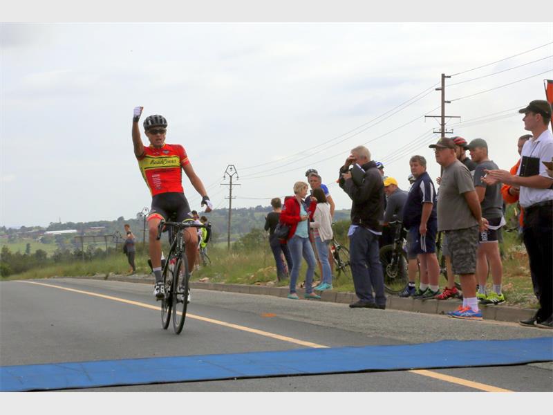 Team Road Cover’s Gustav Basson won the 106-kilometre Rudy Project Berge en Dale cycling classic with a spectacular solo effort in Krugersdorp this weekend (6 February).