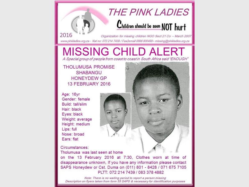 Tholumusa Promise Shabangu is a 16-year-old female who went missing on 13 February. She is tall and slim and of average weight. She has brown eyes and black hair. It is uncertain what she was wearing at the time of her disappearance.