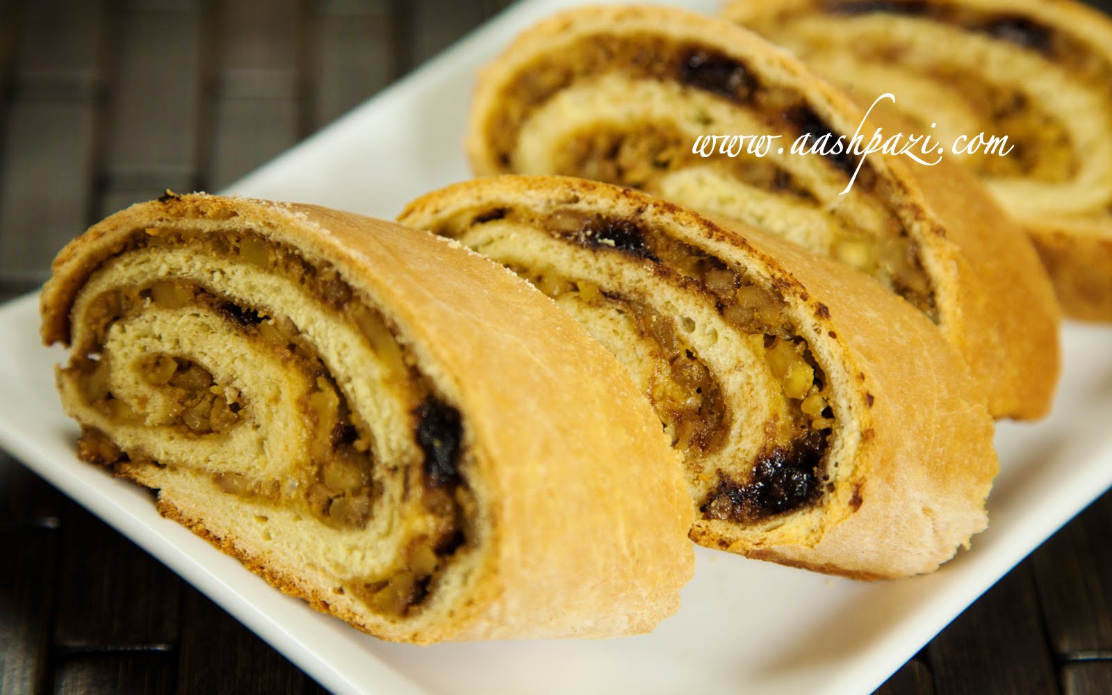 - Spread 2Tblsp of melted butter across the rectangle, making sure that it is well-covered. Use more if needed. Spread almost two cups of the filling across the dough. Drizzle the filling with 1/4 cup of warm honey. Begin rolling from width (not length) as you would a swiss roll. Every two turns prick the dough with a fork. Pinch the ends closed and place seam-side down on the prepared baking sheet.