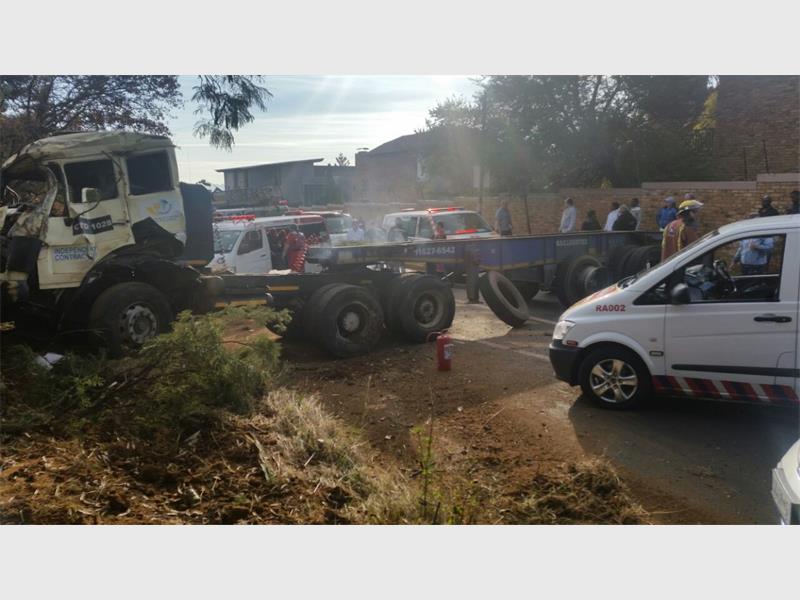 The truck was going down CR Swart Road and turned into Doreen Road. (The truck allegedly already had problems with its brakes on CR Swart Road). As it went down Doreen Road the driver saw the vehicles in front of him backed up but when he tried to stop, his brakes failed. To prevent crashing into the vehicles he quickly turned the truck sideways, jackknifing it on purpose. He prevented the collision but crashed into the barriers on the corner of Lawrence and Doreen Roads.