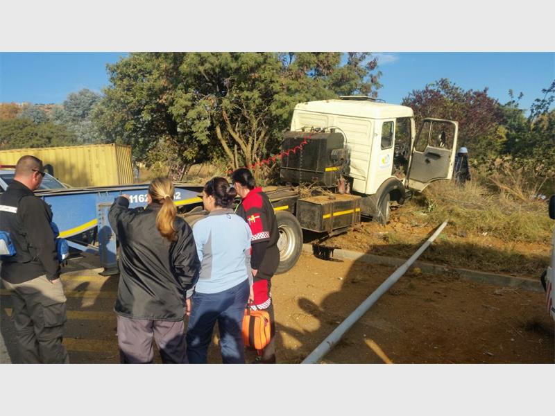The truck was going down CR Swart Road and turned into Doreen Road. (The truck allegedly already had problems with its brakes on CR Swart Road). As it went down Doreen Road the driver saw the vehicles in front of him backed up but when he tried to stop, his brakes failed. To prevent crashing into the vehicles he quickly turned the truck sideways, jackknifing it on purpose. He prevented the collision but crashed into the barriers on the corner of Lawrence and Doreen Roads.