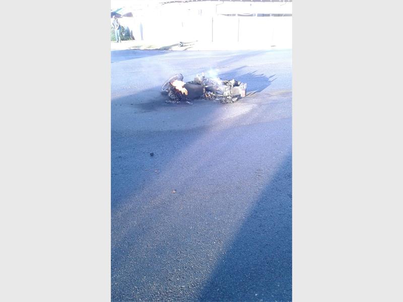 The accident took place at the corner of Honeyball and Gildea Avenues at about 7.40am this morning (15 June). According to an Apcan Security representative the rider told security officers on the scene that the vehicle unexpectedly turned in front of him. The impact caused the motorcycle to spill petrol, which caught fire when it hit the ground.