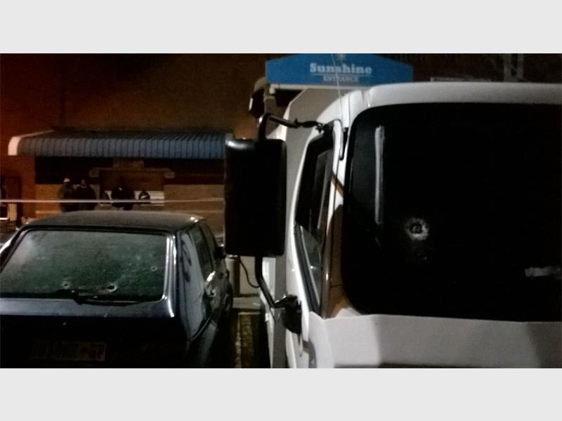 Two people were shot early yesterday evening (21 June) when robbers opened fire on G4S security guards who were collecting money at Sunshine Cash & Carry on Van Wyk Street.